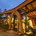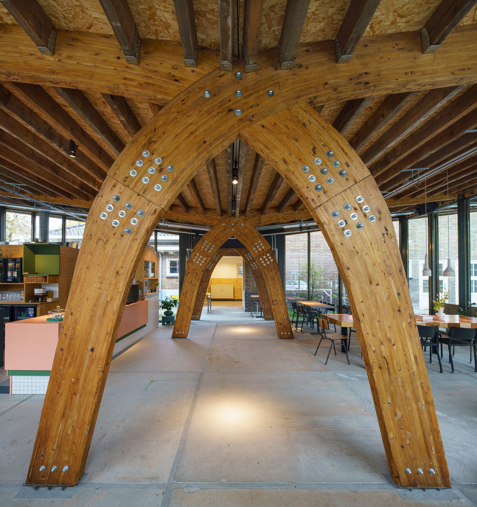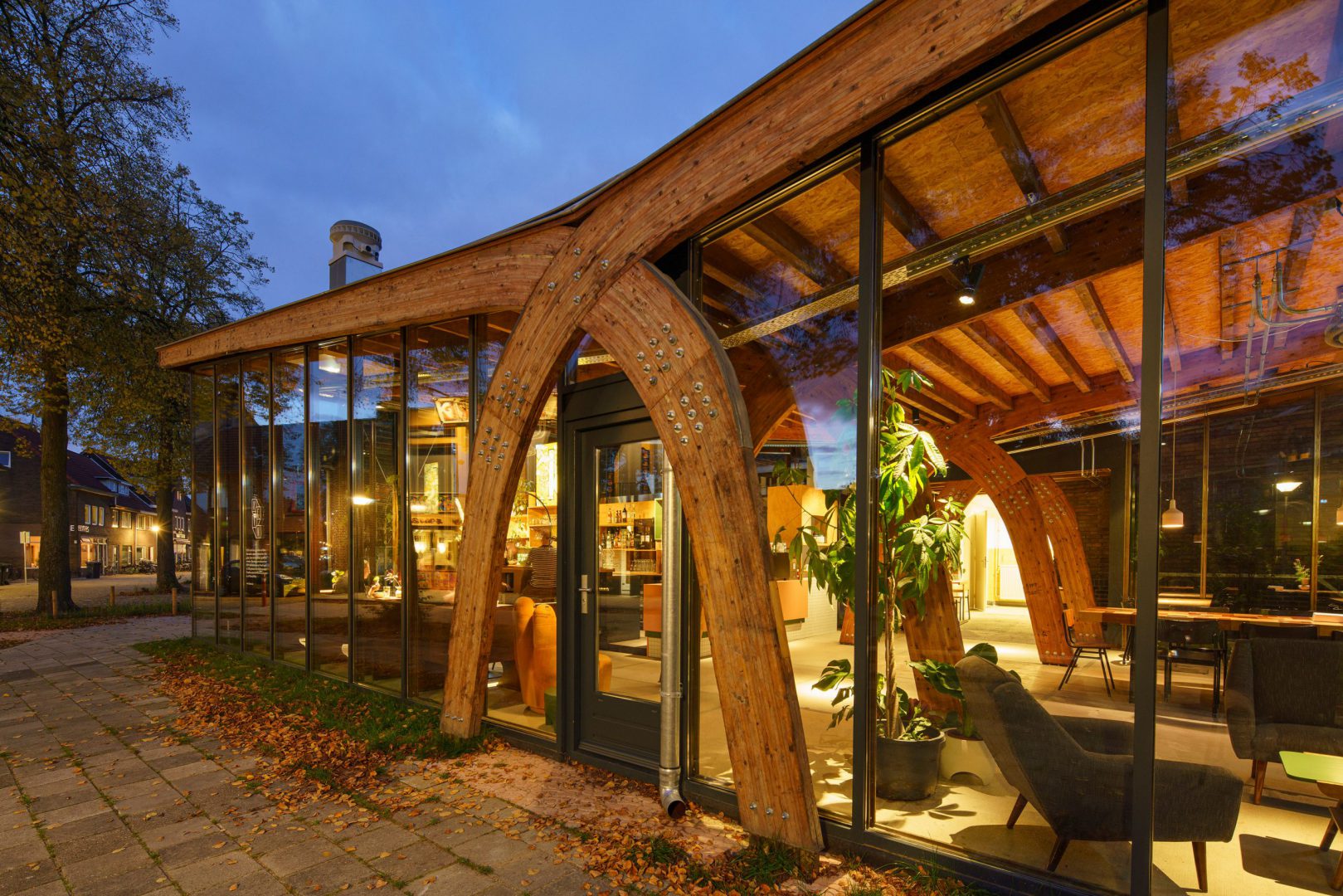 Het paviljoen is grotendeels gebouwd uit hergebruikt materiaal. Een aantal materialen, waaronder de stelcon-platen en de stalen profielen in de fundering komen zelfs van erg dichtbij: Strijp-S. De spanten uit een oude kippenschuur springen het meest in het oog. Deze zijn bewerkt en verzaagd zodat ook de gordingen van dit hout gemaakt konden worden. Het nieuwe gebouw is helemaal droog gebouwd, waardoor het demontabel is en gemakkelijk ergens anders opnieuw kan worden opgebouwd. Het paviljoen is niet gebouwd op een paalfundering, daarom moest de fundering erg zwaar worden. Er zijn drie lagen stelcon-platen aanwezig in de vloer om het nodige gewicht te creëren.